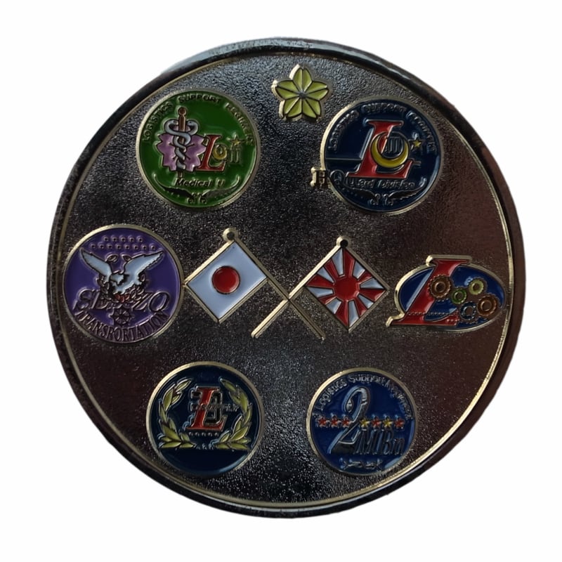 陸上自衛隊 第3後方支援連隊のチャレンジコインです。表、第3後方支援連隊の☆と月をかたどったデザイン。裏、国旗と連隊旗を囲むように連隊本部からなる6つの大隊等、部隊マークがデザインされています。 ※プラスチックケース付き。 ※サイズ:直径約4.5cm