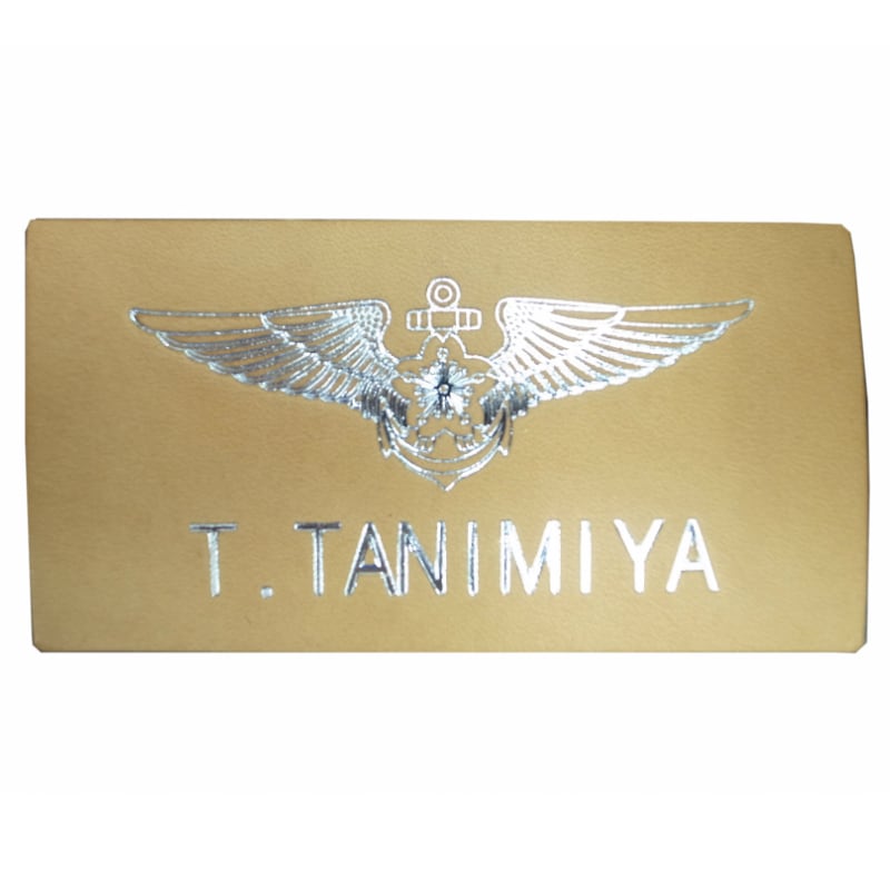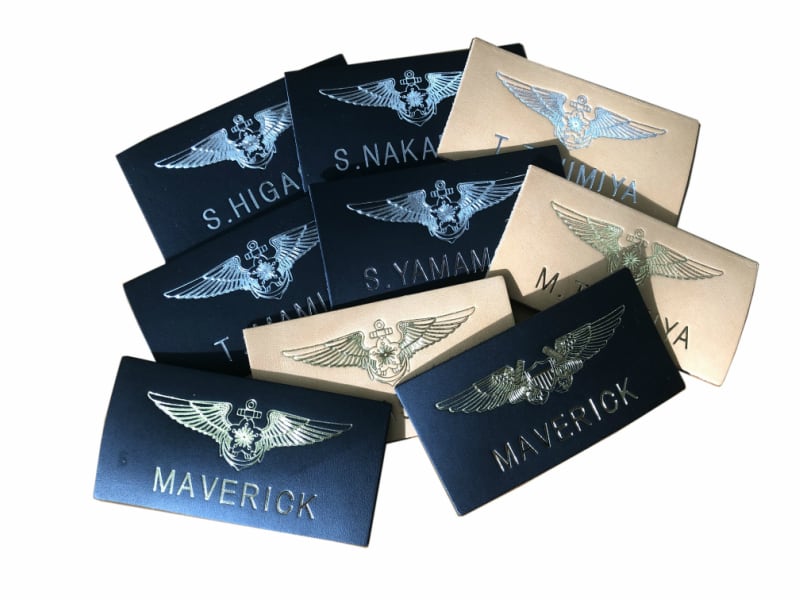 革にき章とご希望の文字を箔押しする、本格的で大人なレザーネームタグです。