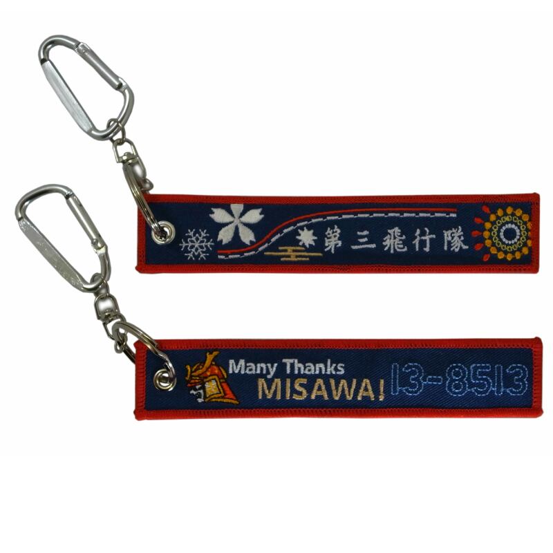 航空自衛隊 三沢基地の第3飛行隊 記念塗装機 刺繍キーホルダーです。片面は、四季の春夏秋冬をイメージしたデザイン、片面は、兜と尾翼番号になっております。バック・カバンのアクセントにいかがでしょうか。 タグ寸法:全長約15cm 幅2.8cm