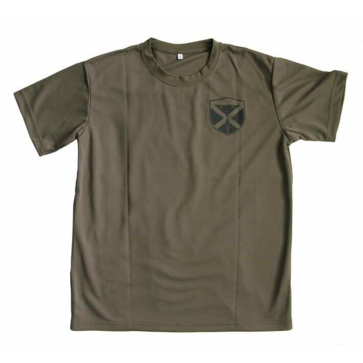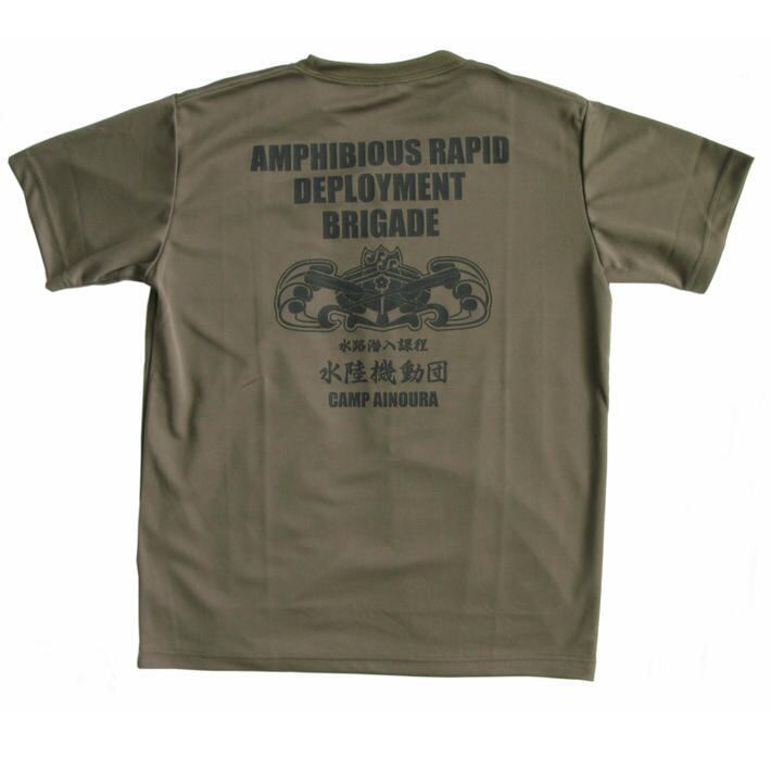 陸上自衛隊水陸機動団の水路潜入徽章と「AMPHIBIOUS RAPID DEPLOYMENT BRIGADE」が背中と胸にプリントされたオリーブカラーのTシャツです。