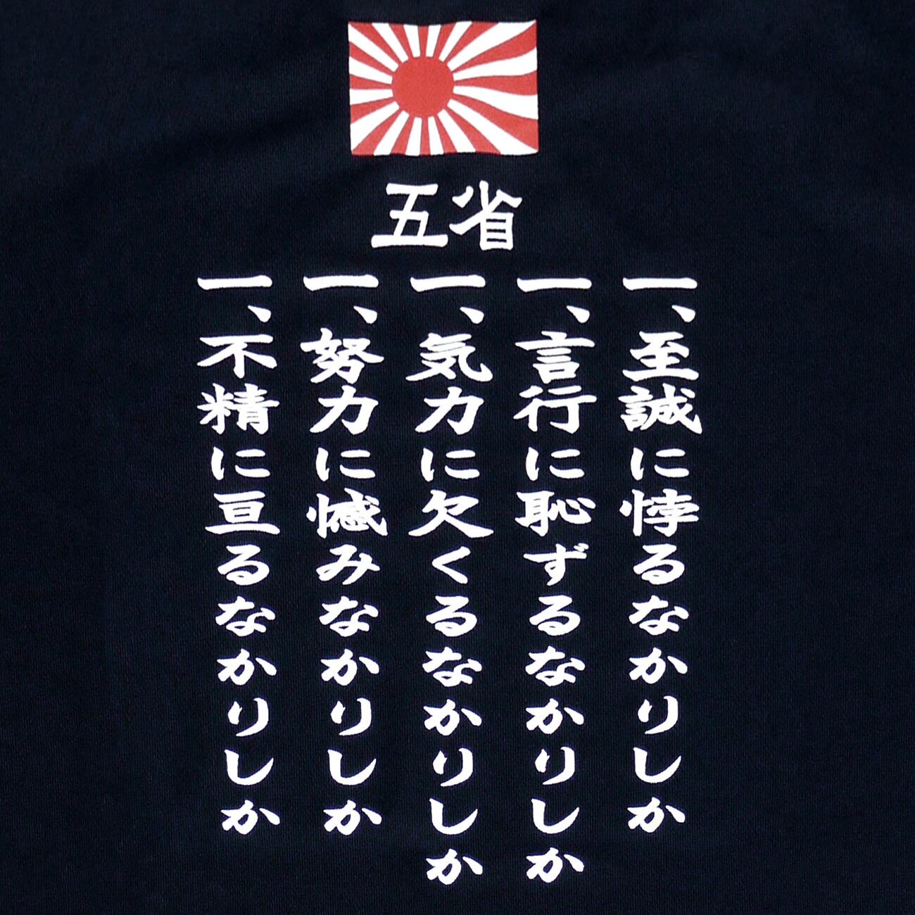 旧海軍(大日本帝国海軍)の士官(=将校、幹部、指揮官)を養成する海軍兵学校に伝わる5つの名言「五省」。 その五省を背中に大きくプリントしたTシャツです。 胸には海軍魂のワンポイント。 速乾吸汗のドライタイプ。 素材:ポリエステル サイズ:着丈 / 身幅 / 袖丈(cm) S: 65 / 47 / 20 M:68 / 50 / 21 L:71 / 53 / 22 LL:74 / 56 / 23 3L:77 / 58 / 23