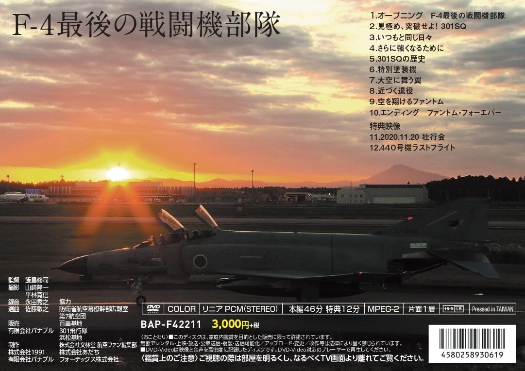 百里基地での訓練風景をはじめ特別塗装機のディティール、世界最終生産機440号機のディティール、更に特典映像では11月に行われた壮行会、浜松基地に到着した世界最終生産機440号機を収録。