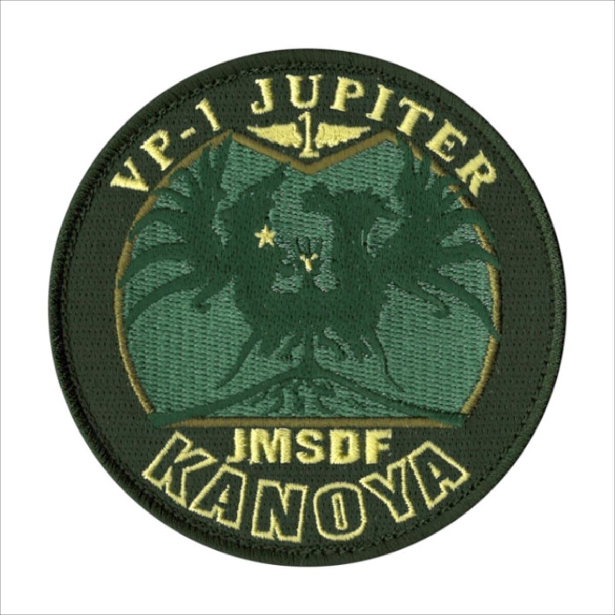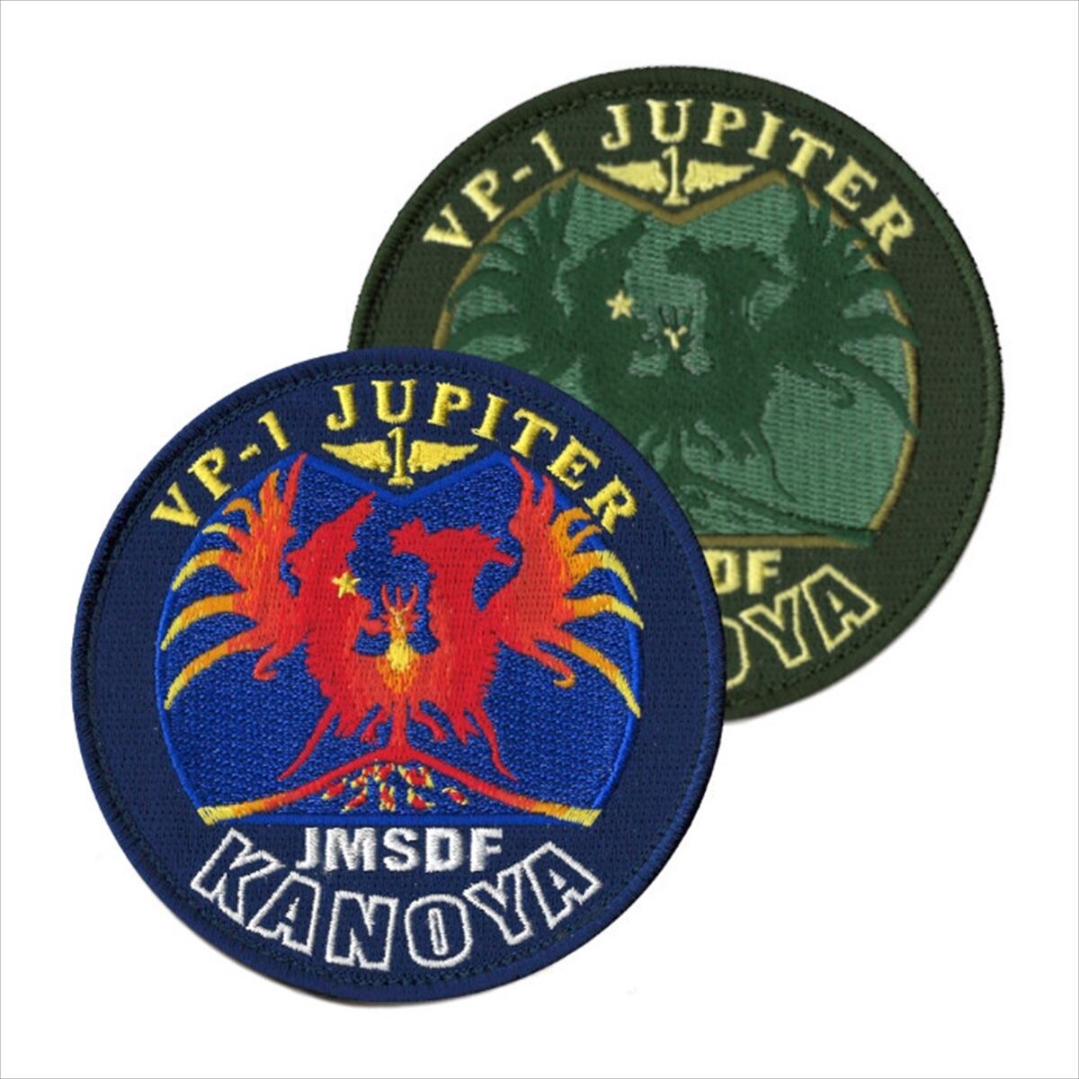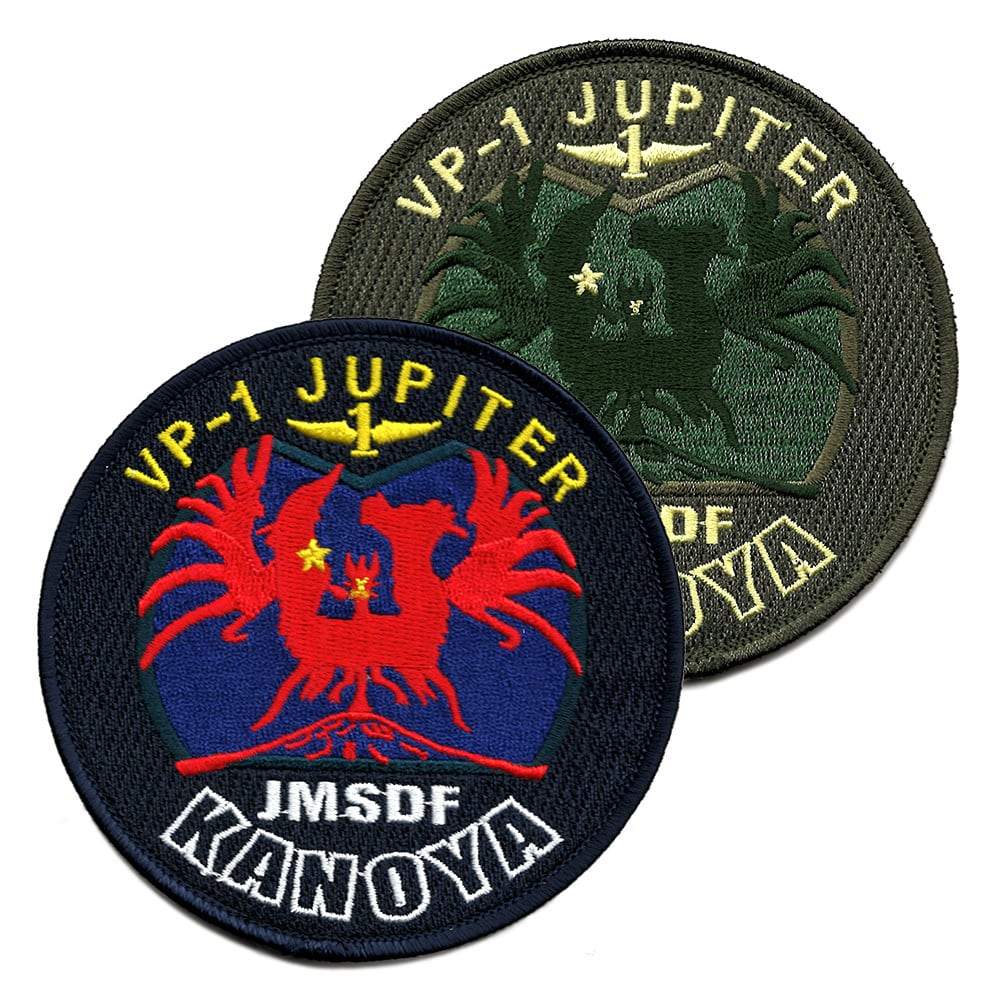 海上自衛隊の鹿屋航空基地 第1航空隊のワッペンです。 ワッペンに付いているVP-1は第1航空隊の英称、JUPITERはP-3Cのコールサイン。 赤い部分は不死鳥を表すと共に、上下反転させると鹿児島県の形が取り入れられおり、星がそれぞれ鹿屋航空基地と桜島を示しています。 黒・赤・青のハイビジと緑・グレーのロービジの2種類。 両面ベルクロ付き。 サイズ:直径約10cm