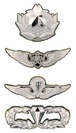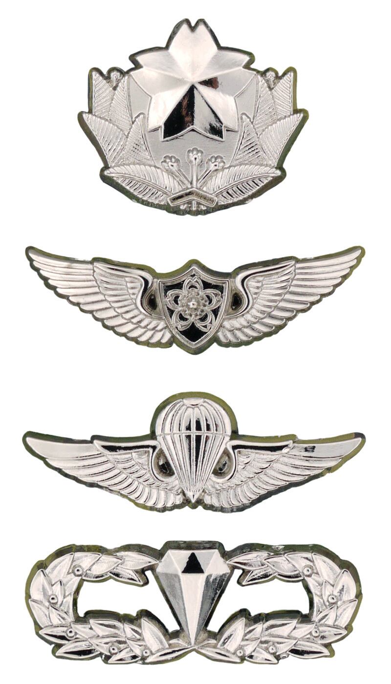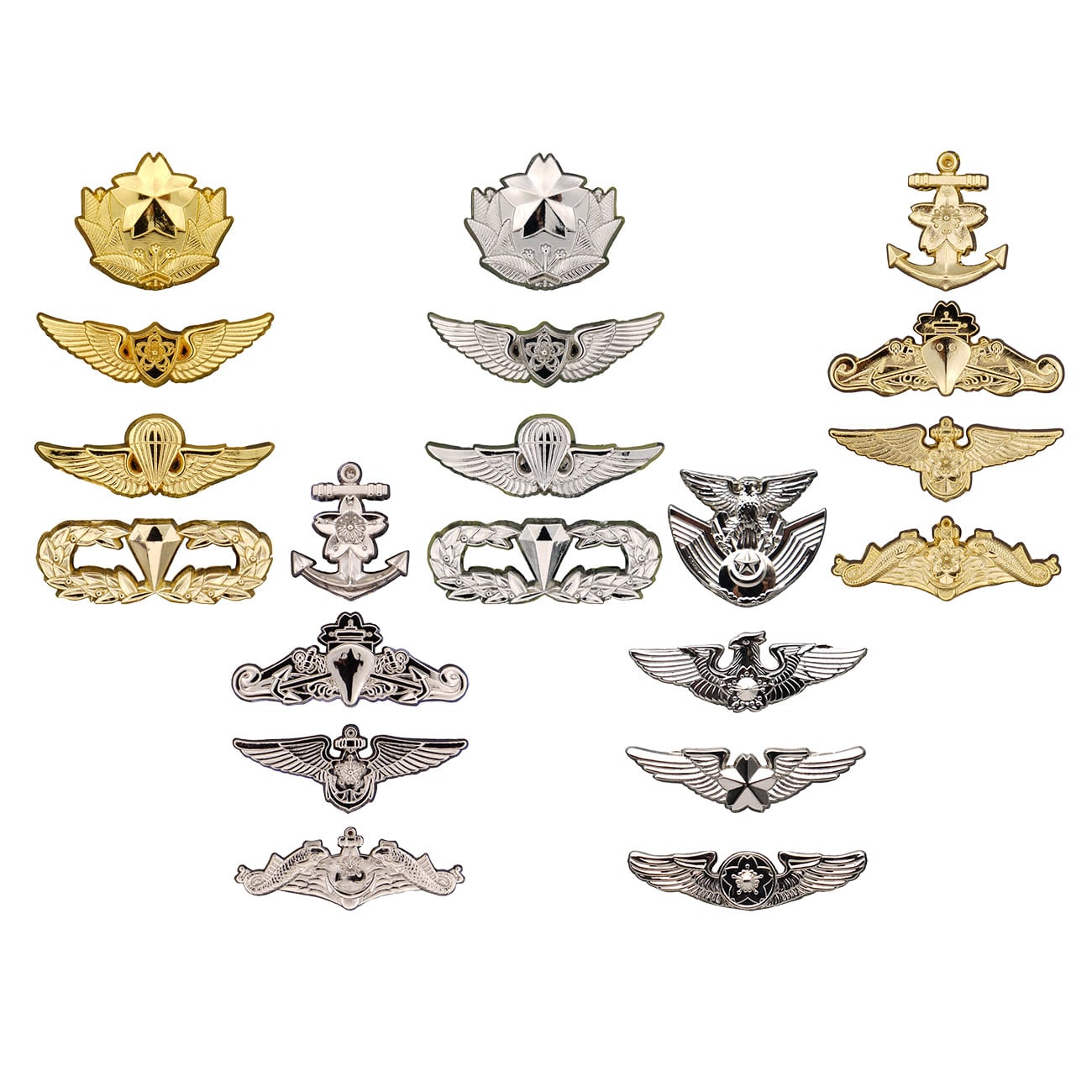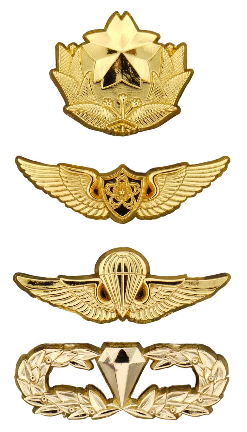 陸上自衛隊と海上自衛隊の航空自衛隊のき章ピンバッジ4個セットです。 陸上自衛隊はエンブレム、航空、空挺、レンジャーの4種。 海上自衛隊はエンブレム、艦艇、航空、潜水艦の4種。 航空自衛隊はエンブレム、操縦士、航空士、部隊章の4種がセットです。 ズレにくいように留め具が2個になっているタイプも含まれます。 サイズ:約3cm(種類により異なる)