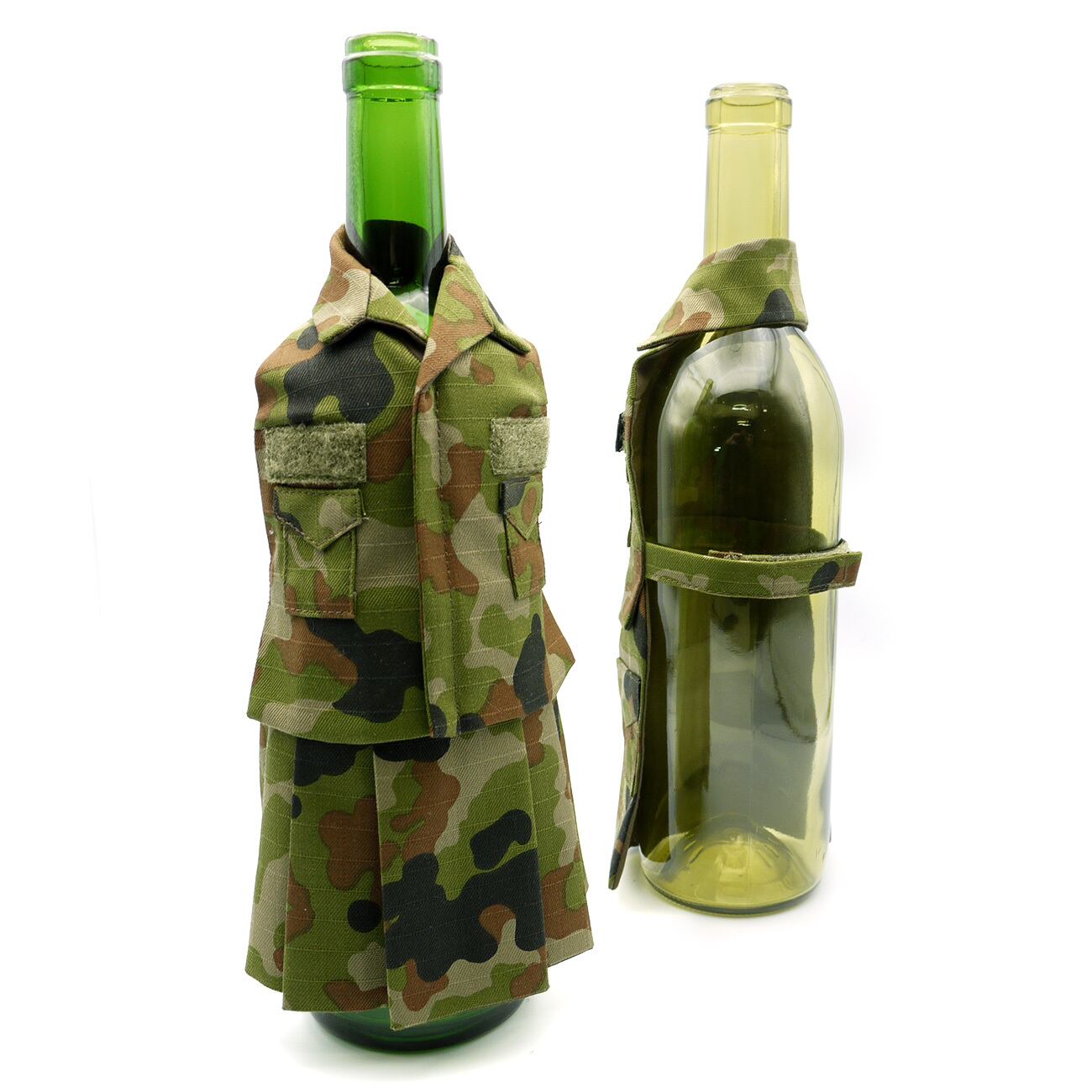 ワインボトルカバーの自衛隊仕様が誕生! 背面マジックテープで様々な大きさのボトルに簡単に装着出来ます。 陸上自衛隊と海上自衛隊の迷彩2種×ズボンとスカートの2パターン=全4種類をご用意しました。 お祝い事でのディスプレイや、自衛隊ファンな友人へのプレゼントに如何でしょうか? ※胸のネームタグは別売りです。 サイズ: ズボン:約15×26.5cm スカート:約19.5×24.5cm ボトル直径9cmまで対応