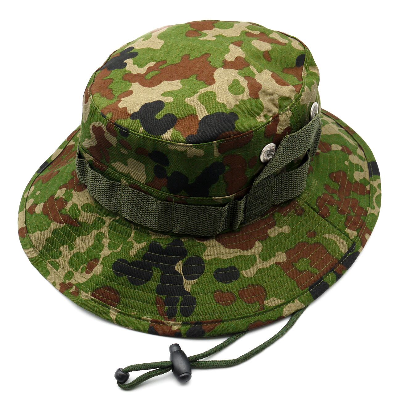 迷彩柄のブーニーハットです。 別名アドベンチャーハット。 側面のウェビングは枝などを刺すカモフラージュ用のものです。 素材:ポリエステル、綿 サイズ:M56cm、L58cm、LL61cm