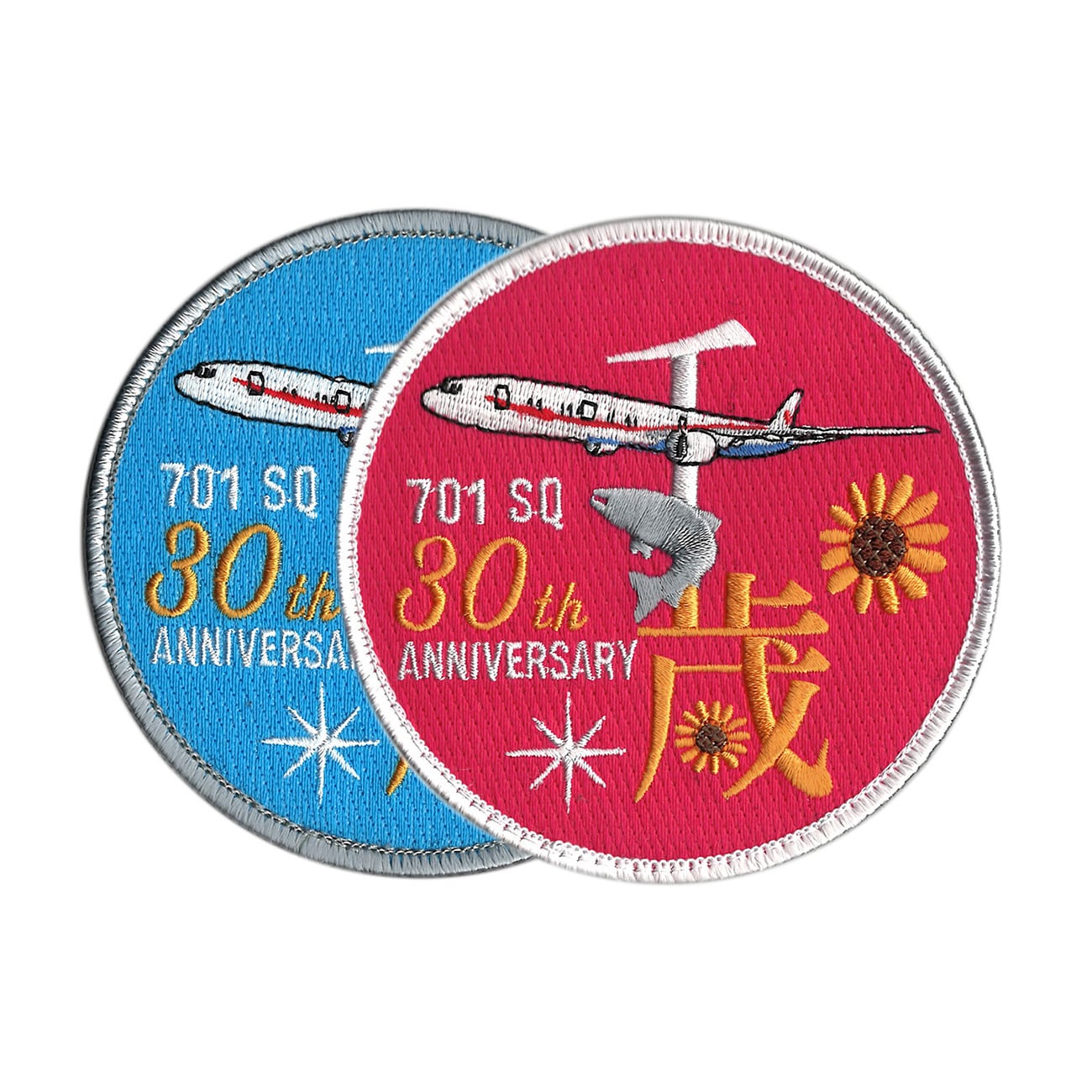航空自衛隊 千歳基地 特別航空輸送隊創立30周年記念ワッペンです。B777-300ER政府専用機と北海道の夏をイメージしたひまわり、市の魚のサケのデザインです。 赤と水色をお選びいただけます。 サイズ 約10㎝ ※両面ベルクロ付き